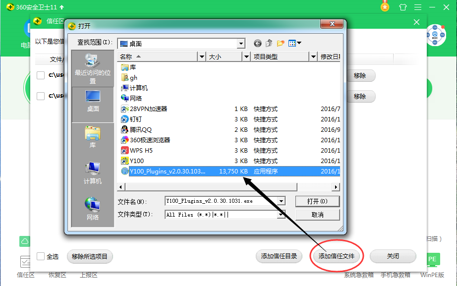 3、请点击信任区界面右下角的【添加文件】;寻找到Y100阅卷助手文件的路径选中添加;