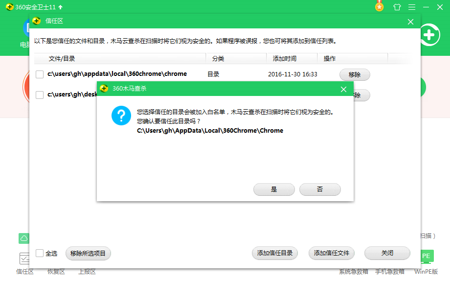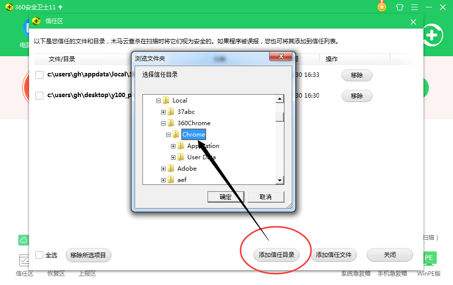 请点击信任区界面右下角的【添加目录】;寻找到Y100阅卷助手安装目录文件夹Chrome选中添加;