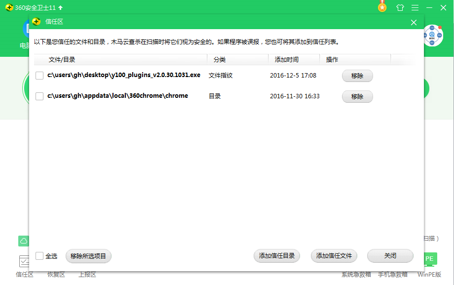 2、点击木马查杀界面左下角的《信任区》选项。信任区界面如下图所示。