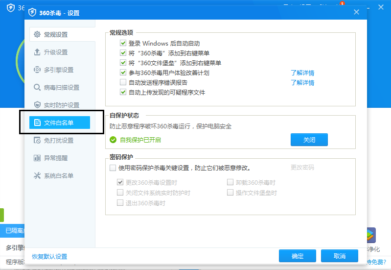 2、在“360杀毒-设置”界面中点击“文件白名单”,