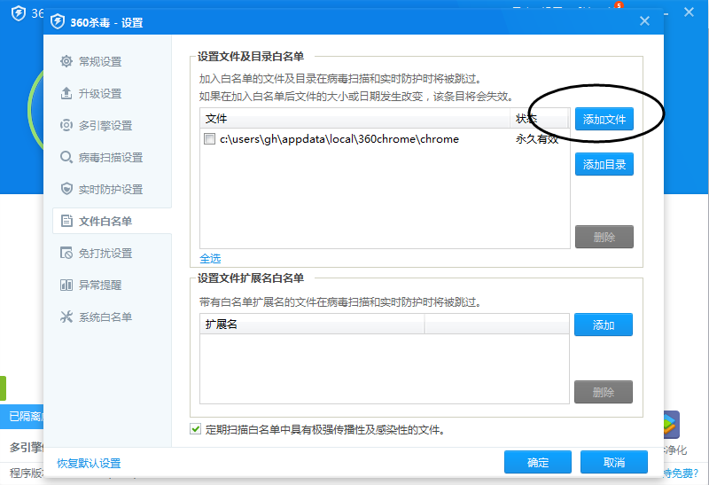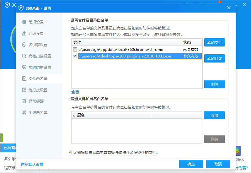 6、这时在“360杀毒-设置”“文件白名单”中就可以看到添加的文件了,然后点击“确定”按钮。