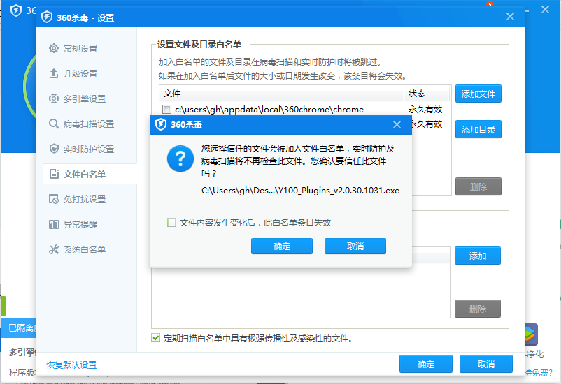 5、在“文价内容发生变化后此白名单失效”前面把勾去掉,然后点击“确定”按钮